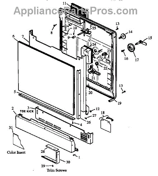 This factory screw secures appliance components to their mounting points. Replace missing, worn, or stripped hardware to restore a tight fit, proper alignment, and quieter operation across the affected assembly.