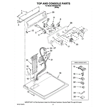 The Console Clip is an OEM part compatible with Whirlpool dryers. This clip secures the control console assembly to the top panel, ensuring it is firmly mounted during operation. Properly functioning clips are necessary to maintain the correct alignment of controls and prevent detachment.