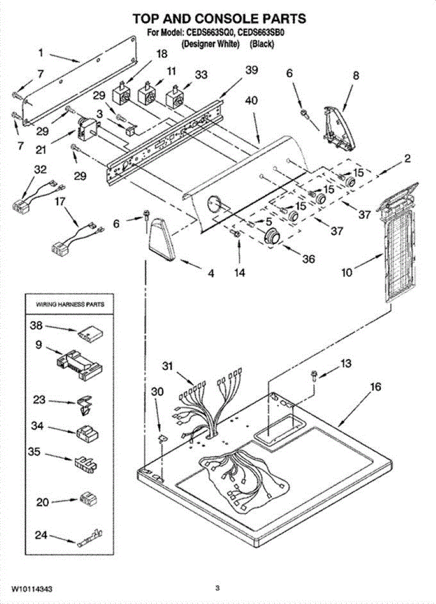 Wire harness assembly that routes power and control signals between dryer components. Replace if wires are damaged, worn, broken, or connections are loose.