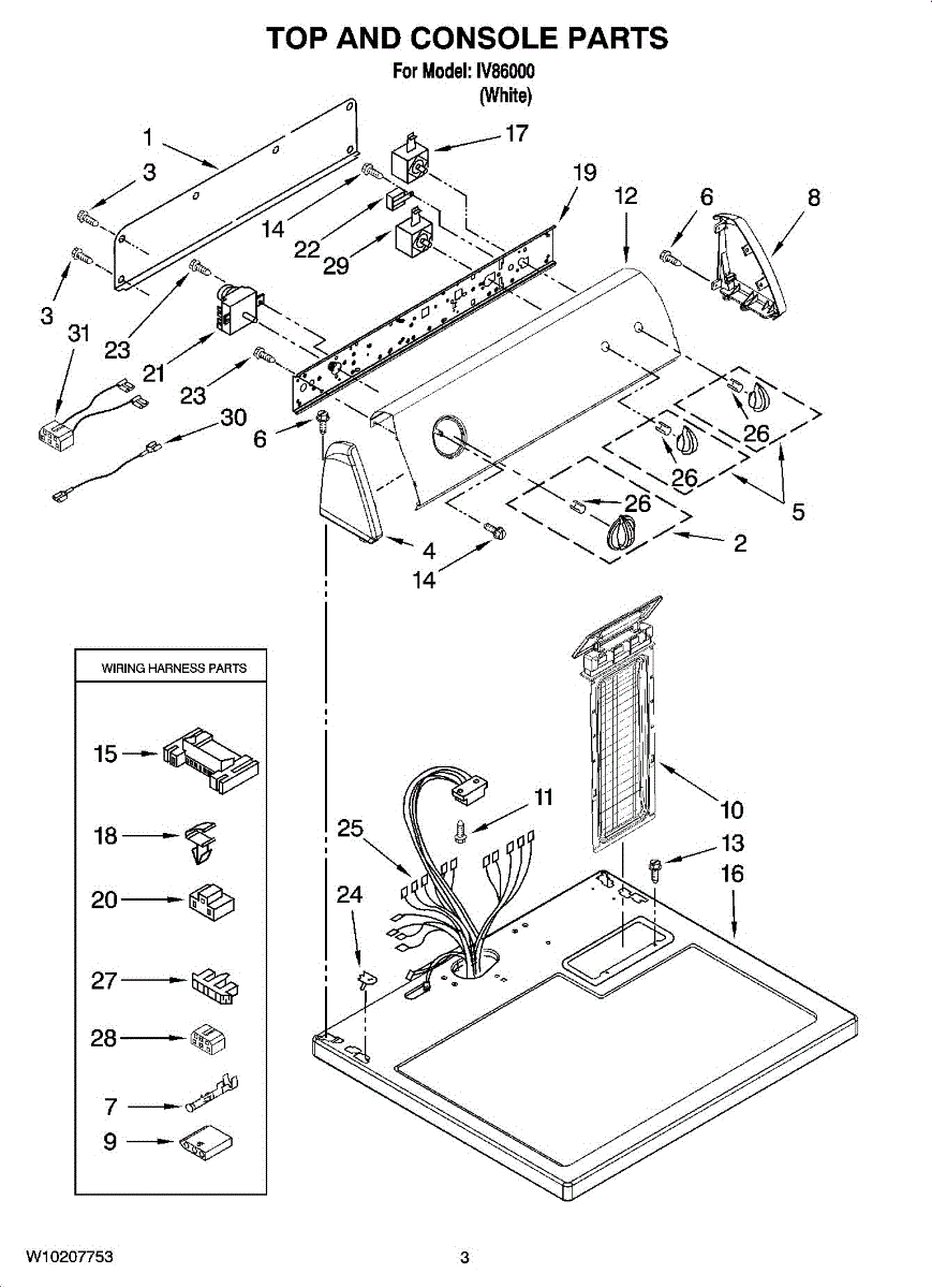 Wire harness assembly that routes power and control signals between dryer components. Replace if wires are damaged, worn, broken, or connections are loose.