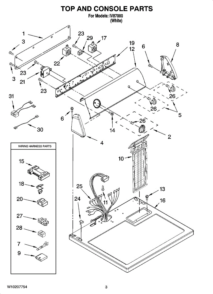 Internal wire harness for dryers. Connects electrical components inside the cabinet. Replace if wires are frayed, damaged, or connectors are broken.