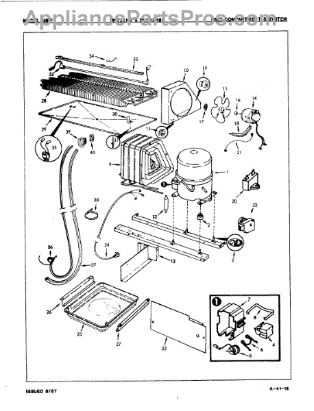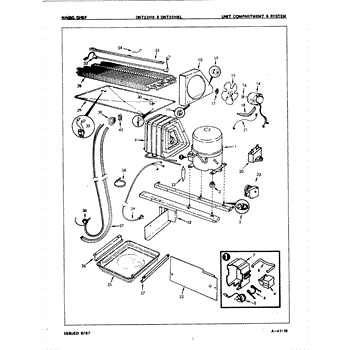 Plastic defrost pan. Evaporator pan hangs from side rails and rests on compressor.