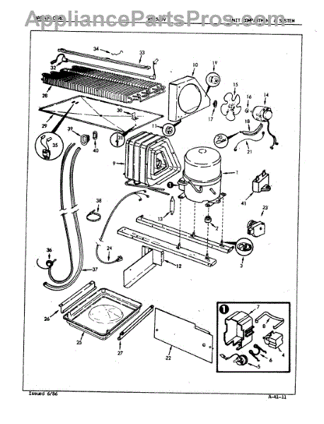Plastic defrost pan. Evaporator pan hangs from side rails and rests on compressor.