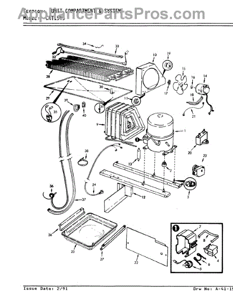 Plastic defrost pan. Evaporator pan hangs from side rails and rests on compressor.