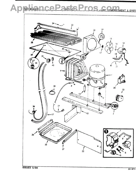 Plastic defrost pan. Evaporator pan hangs from side rails and rests on compressor.