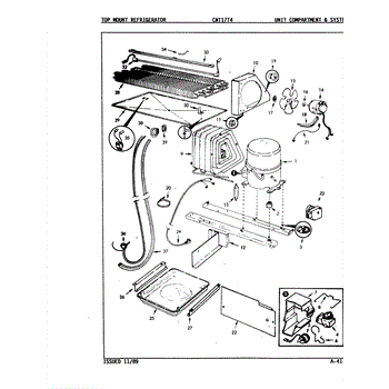 Plastic defrost pan. Evaporator pan hangs from side rails and rests on compressor.