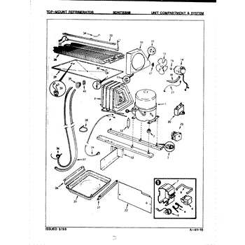 Plastic defrost pan. Evaporator pan hangs from side rails and rests on compressor.