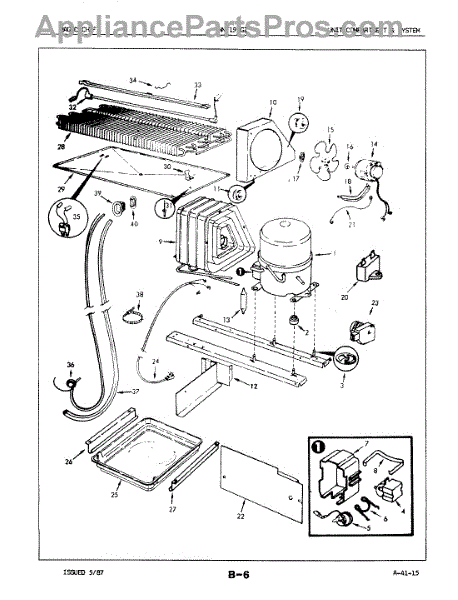 Plastic defrost pan. Evaporator pan hangs from side rails and rests on compressor.