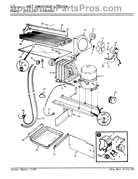 Plastic defrost pan. Evaporator pan hangs from side rails and rests on compressor.