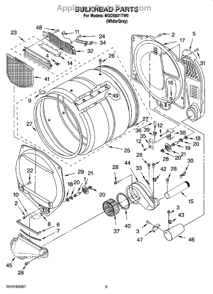 This front drum bulkhead is the stationary front panel that supports the dryer drum and seals the drum opening to maintain proper airflow and drum alignment for reliable drying performance. What it does: