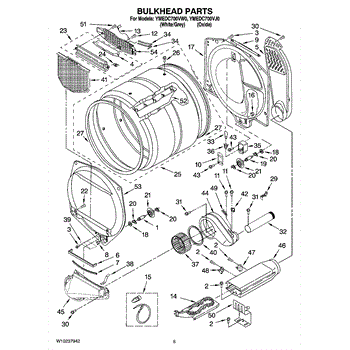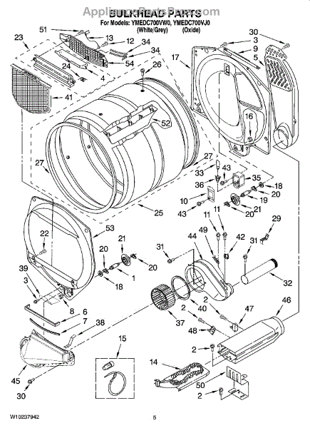 This front drum bulkhead is the stationary front panel that supports the dryer drum and seals the drum opening to maintain proper airflow and drum alignment for reliable drying performance. What it does: