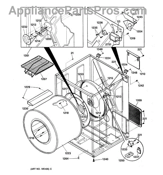 The Rear Drum Bearing Kit is an OEM part for GE dryers. The kit includes a rear bearing, shaft support, ball shaft, ball bearing, ball bearing retainer, high-temperature lubricant, and screws required for installation.