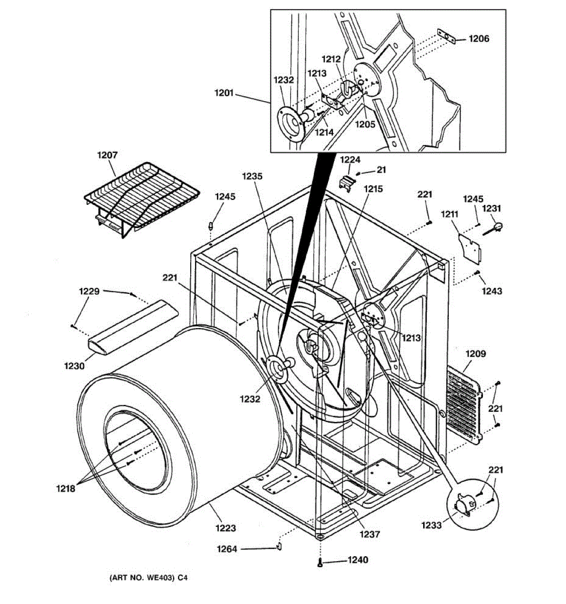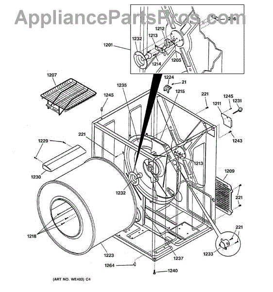 The Rear Drum Bearing Kit is an OEM part for GE dryers. The kit includes a rear bearing, shaft support, ball shaft, ball bearing, ball bearing retainer, high-temperature lubricant, and screws required for installation.