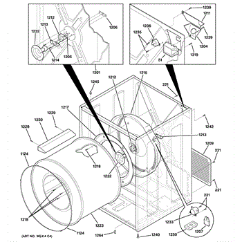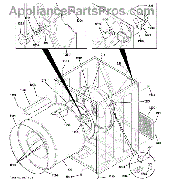 The Rear Drum Bearing Kit is an OEM part for GE dryers. The kit includes a rear bearing, shaft support, ball shaft, ball bearing, ball bearing retainer, high-temperature lubricant, and screws required for installation.