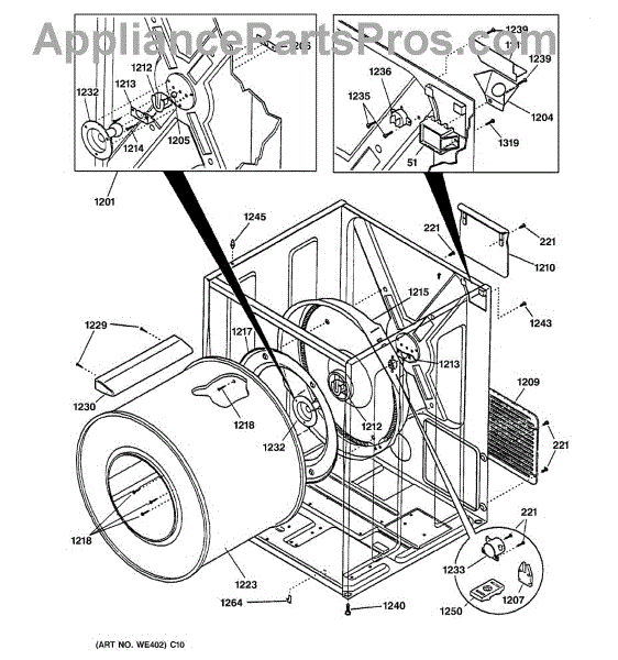 The Rear Drum Bearing Kit is an OEM part for GE dryers. The kit includes a rear bearing, shaft support, ball shaft, ball bearing, ball bearing retainer, high-temperature lubricant, and screws required for installation.