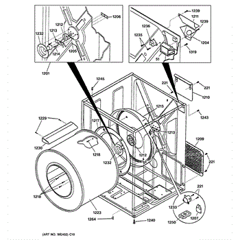 The Rear Drum Bearing Kit is an OEM part for GE dryers. The kit includes a rear bearing, shaft support, ball shaft, ball bearing, ball bearing retainer, high-temperature lubricant, and screws required for installation.