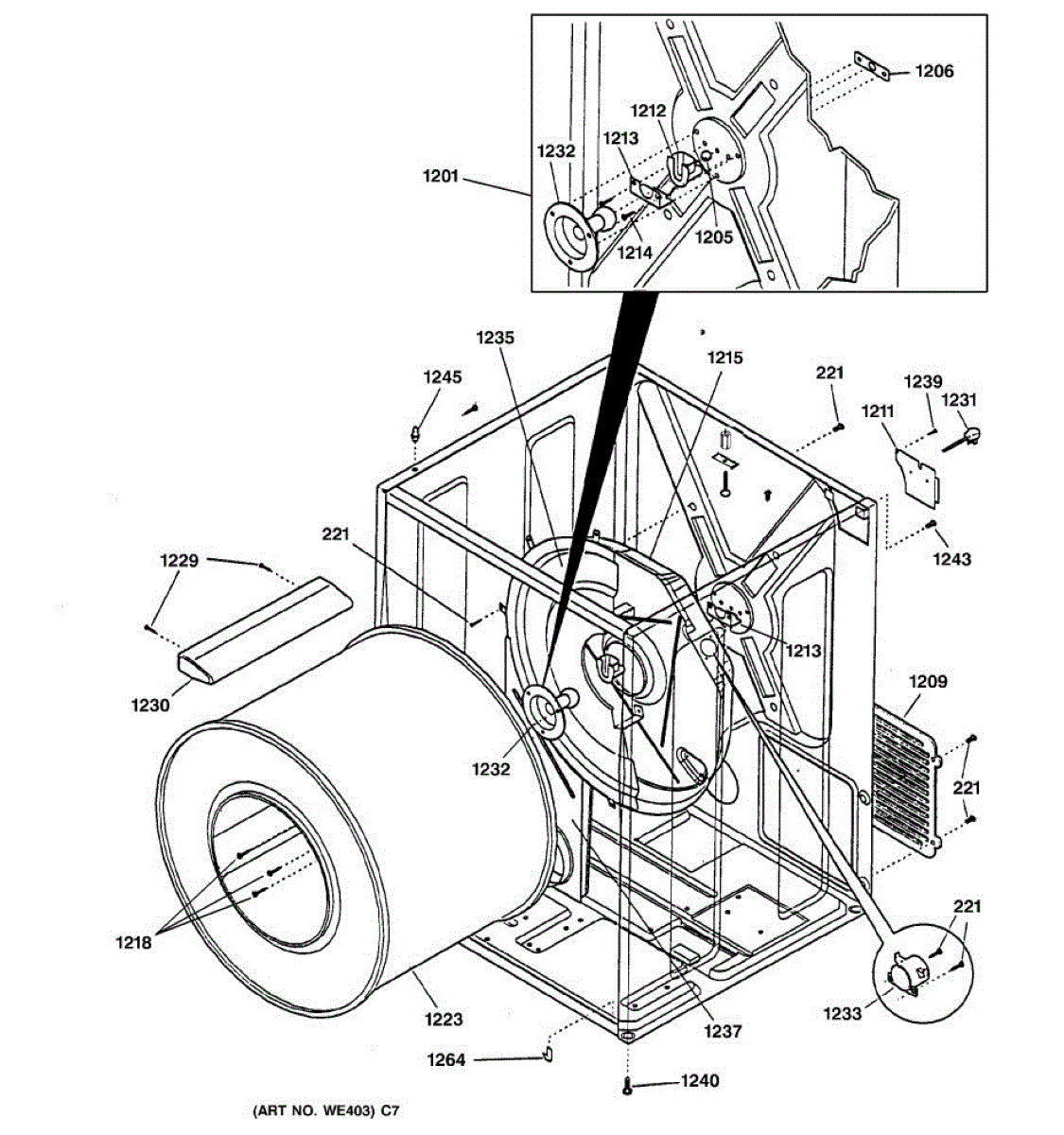 The Rear Drum Bearing Kit is an OEM part for GE dryers. The kit includes a rear bearing, shaft support, ball shaft, ball bearing, ball bearing retainer, high-temperature lubricant, and screws required for installation.