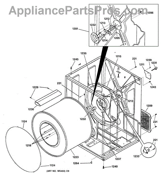 The Rear Drum Bearing Kit is an OEM part for GE dryers. The kit includes a rear bearing, shaft support, ball shaft, ball bearing, ball bearing retainer, high-temperature lubricant, and screws required for installation.