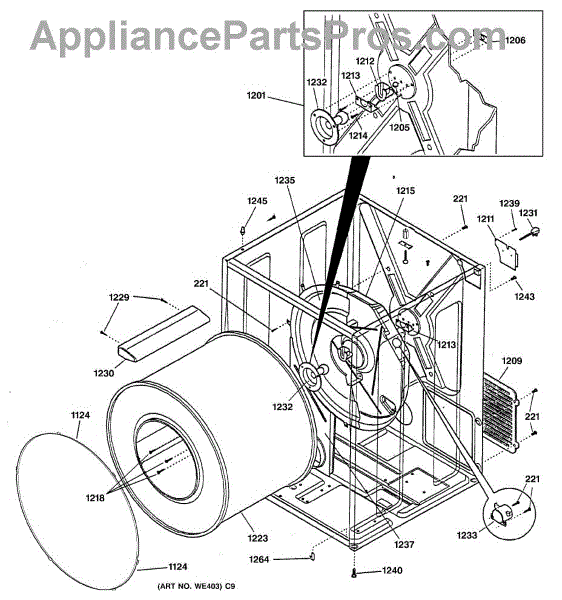 The Rear Drum Bearing Kit is an OEM part for GE dryers. The kit includes a rear bearing, shaft support, ball shaft, ball bearing, ball bearing retainer, high-temperature lubricant, and screws required for installation.