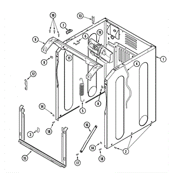This cabinet spring secures the appliance cabinet to the frame to control movement and vibration. Replacing a fatigued or broken spring restores cabinet stability and helps reduce rattling and excessive shaking during operation.