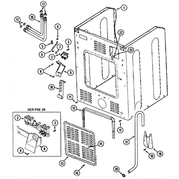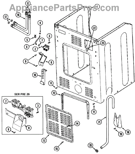 This small strainer sits inside the washer's water inlet valve and screens out sand, rust, and sediment from the supply lines. Replacing a clogged or missing screen restores normal fill flow and helps protect the valve.