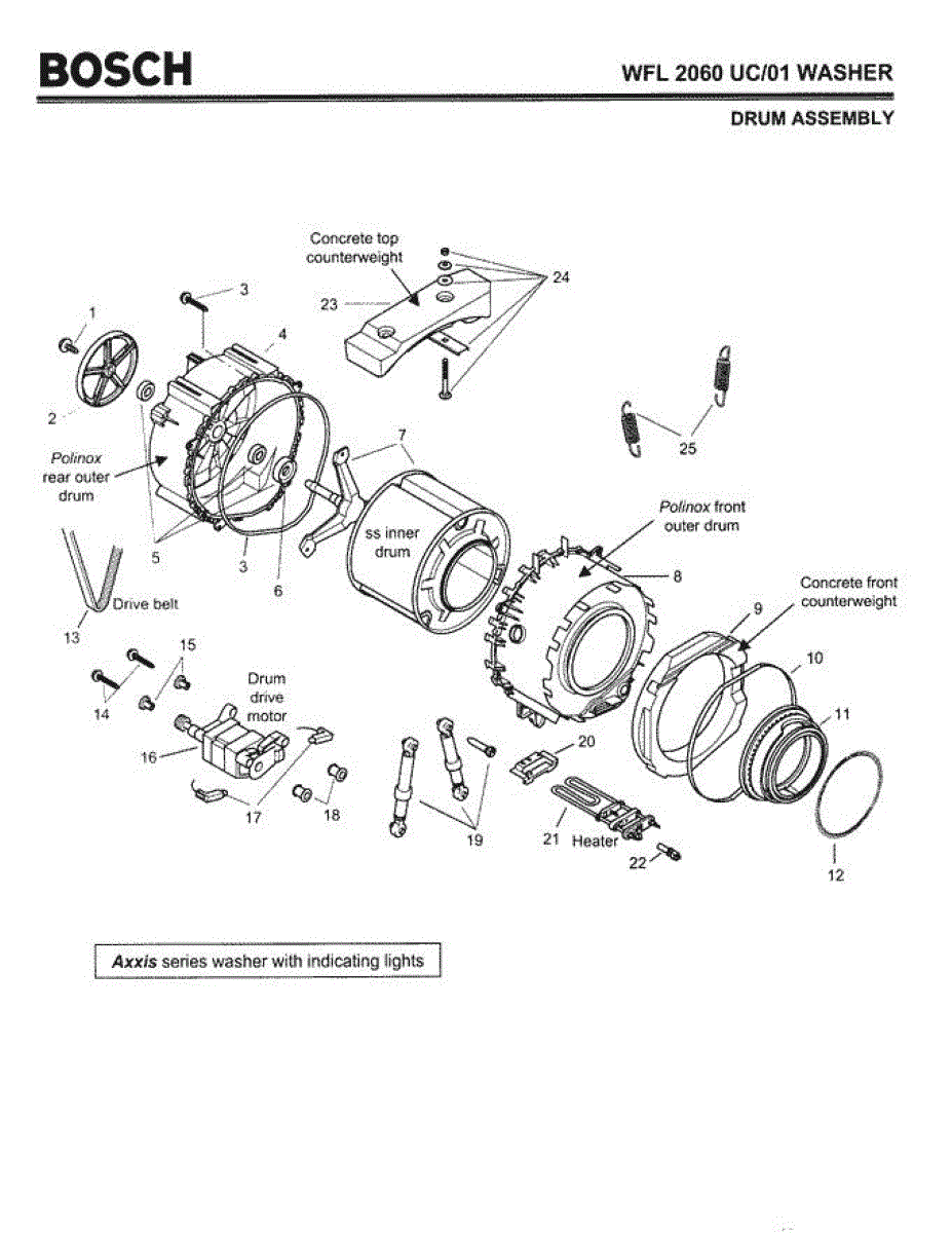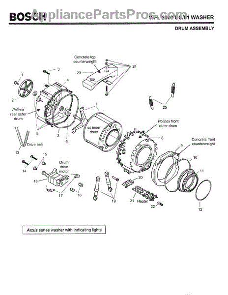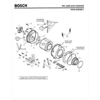 Secures the front counterweight to the washer drum. Replace if strap is cracked, broken, worn, or missing to restore proper weight distribution.