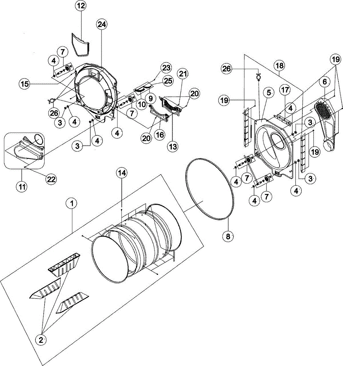 Replacement drum support roller for dryers. Mounts on the axle to support the drum and enable smooth rotation. Replace if worn, cracked, or noisy.