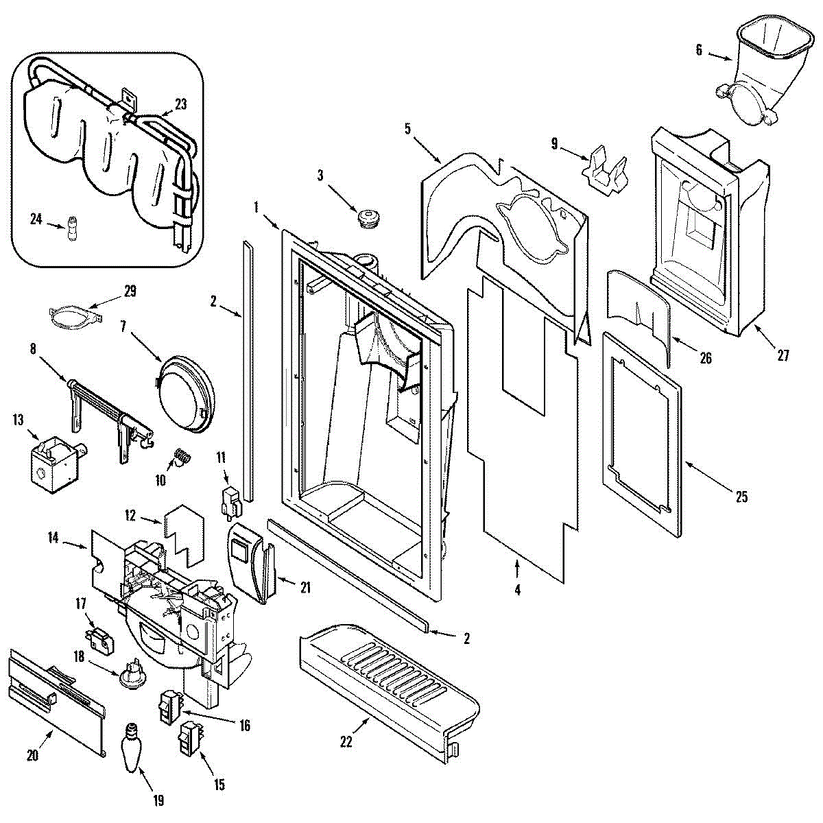 This ice door spring restores the closing tension on the dispenser chute door. Replacing a fatigued spring helps the flap seal properly after dispensing, reducing warm-air leaks that cause frost buildup and ice clumping around the chute. What it does: