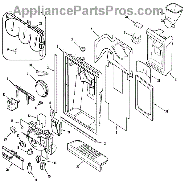 This ice door spring restores the closing tension on the dispenser chute door. Replacing a fatigued spring helps the flap seal properly after dispensing, reducing warm-air leaks that cause frost buildup and ice clumping around the chute. What it does: