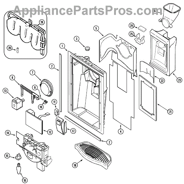 The Ice Door Fountain Kit is an OEM replacement part for Whirlpool refrigerators with built-in ice makers. It directs water to the ice molding trays and facilitates automated ice cube harvesting. Kit includes flapper, solenoid, strike arm, solenoid plunger, and instructions. Spring is not included. For the spring order 61004388.