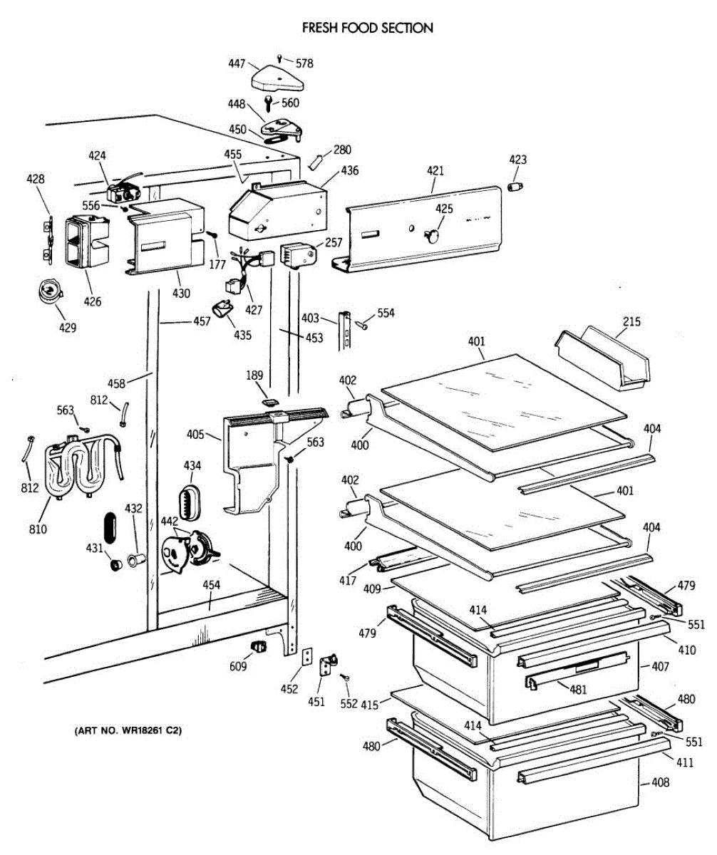 This left-hand drawer slide assembly mounts inside the refrigerator's fresh food section. It supports the shelf/cover and guides the drawer on its track, restoring smooth operation and proper alignment when the original rail is cracked or worn.