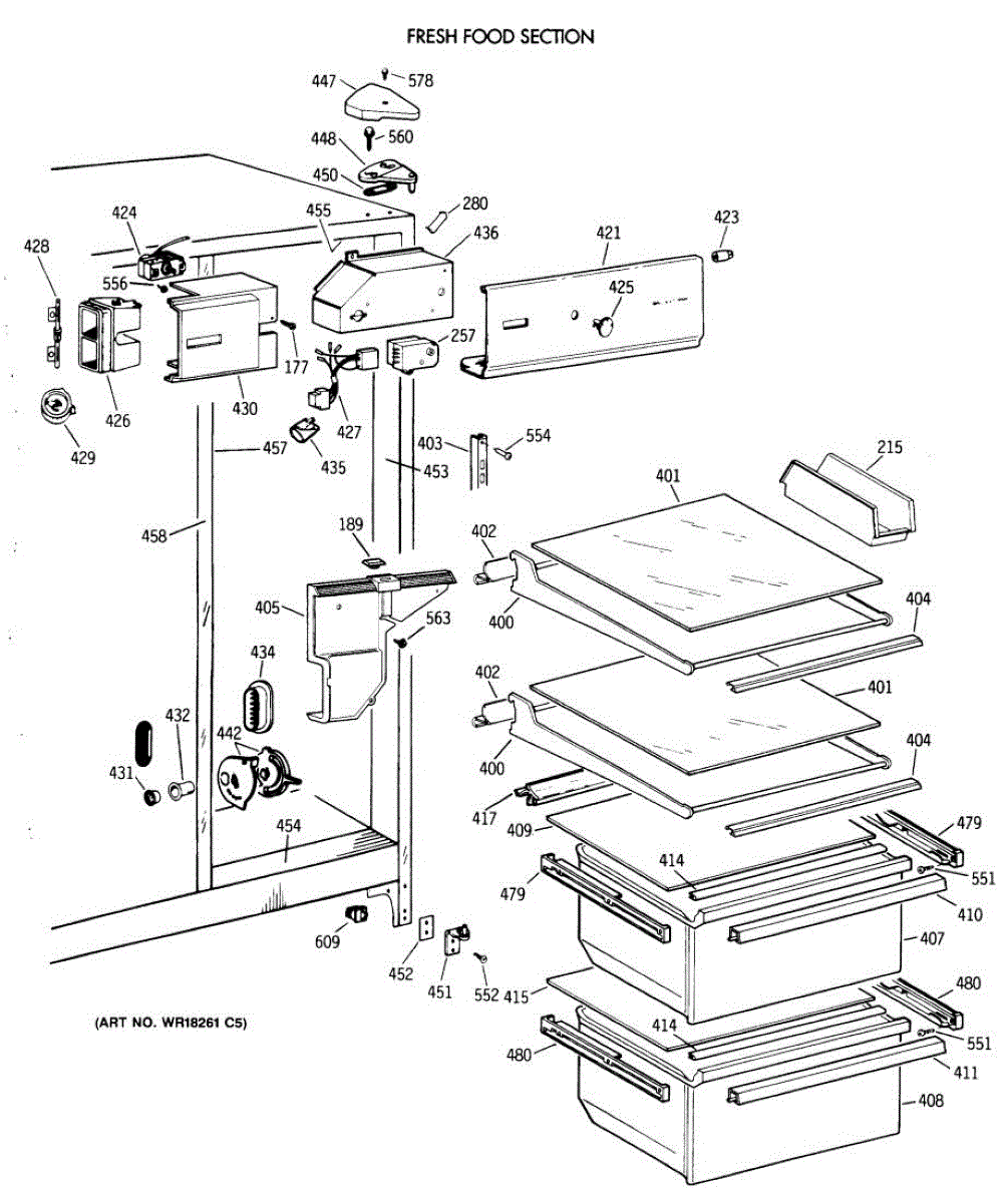 This left-hand drawer slide assembly mounts inside the refrigerator's fresh food section. It supports the shelf/cover and guides the drawer on its track, restoring smooth operation and proper alignment when the original rail is cracked or worn.