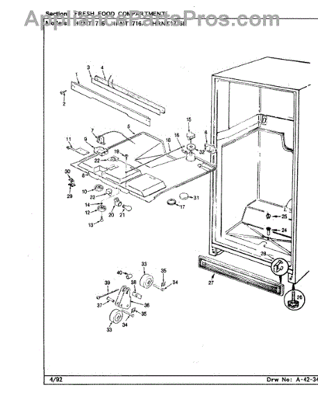 This factory screw secures appliance components to their mounting points. Replace missing, worn, or stripped hardware to restore a tight fit, proper alignment, and quieter operation across the affected assembly.