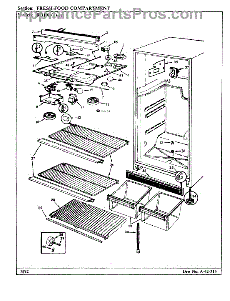 The crisper shelf center support stabilizes the pan cover above the crisper drawers to keep it level under load. Replace a cracked or missing support to restore proper shelf alignment and smooth crisper drawer operation.
