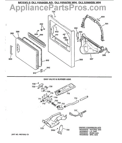 Meters gas flow to the dryer burner. Replace if damaged, clogged, or when converting between natural gas and LP. Installs at the burner assembly.