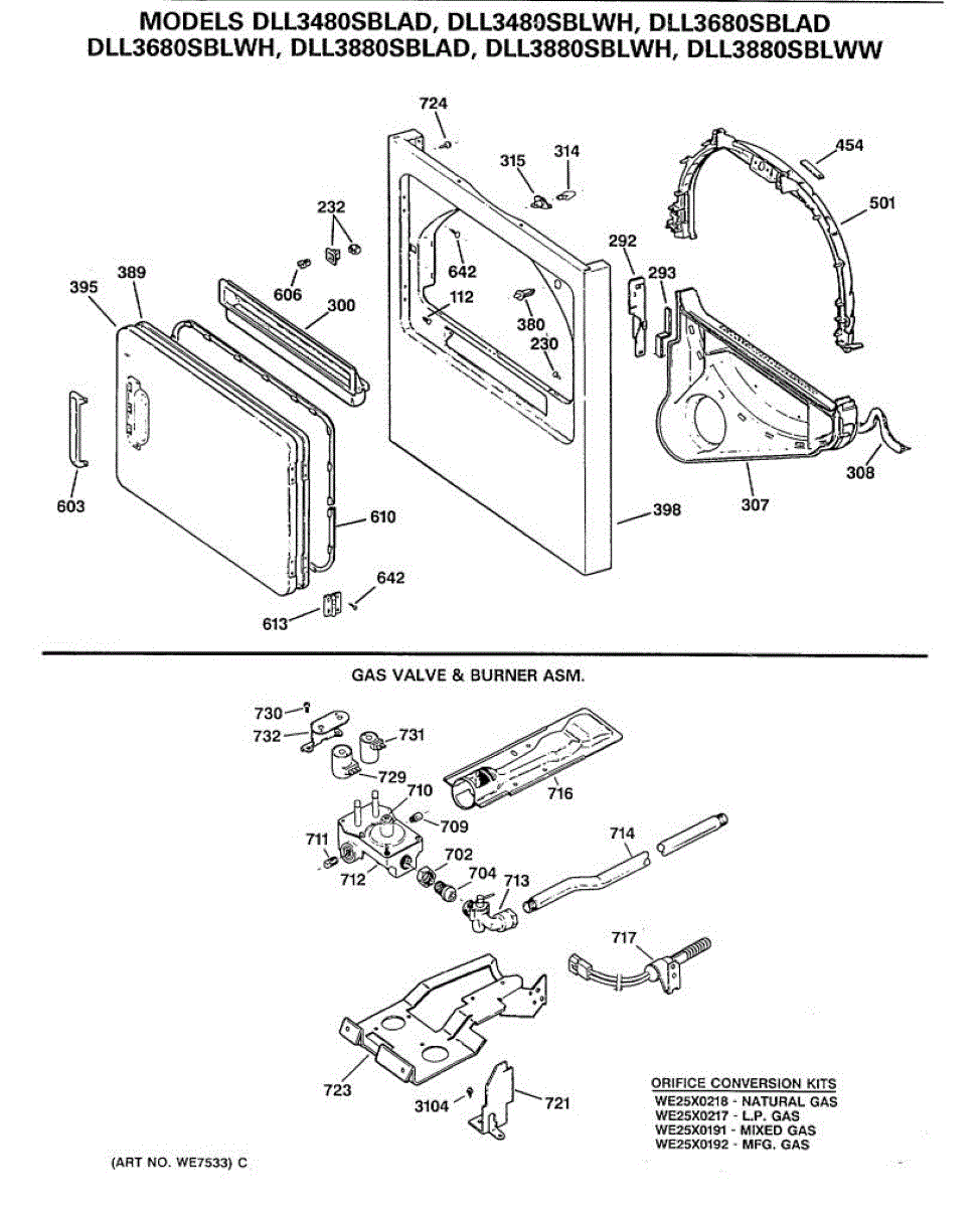 Meters gas flow to the dryer burner. Replace if damaged, clogged, or when converting between natural gas and LP. Installs at the burner assembly.