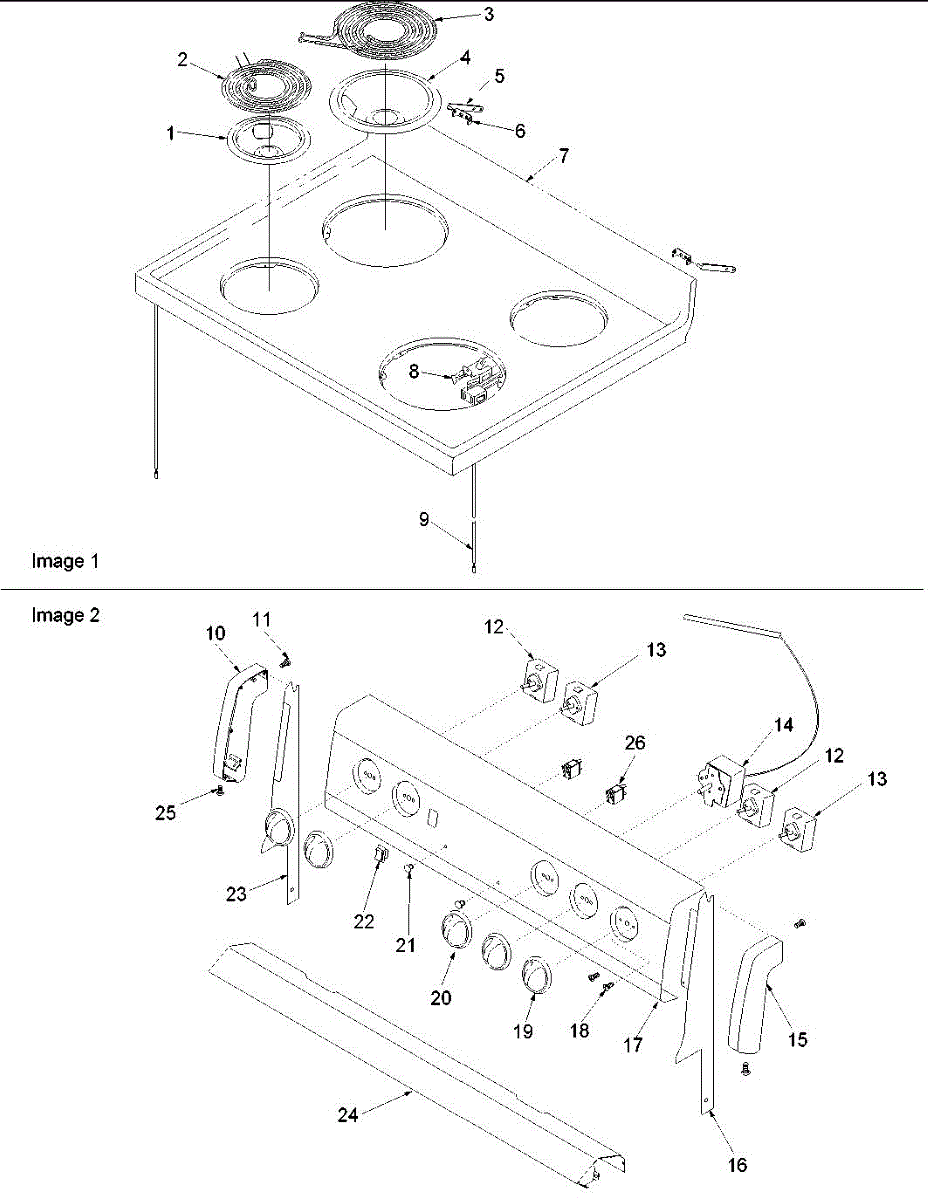 Shallow metal drip pan installs below burner elements to catch grease and spills. Replace when discolored, rusted, warped, or damaged for a clean cooktop.