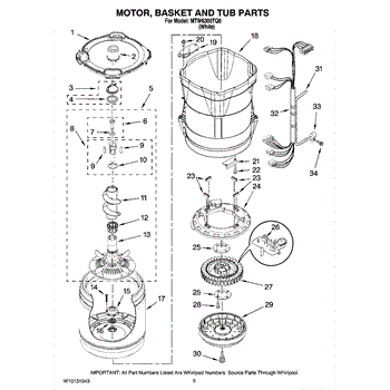 Outer tub assembly includes: outer tub, tub seal, drive shaft and bearings. To rebuild the tub, order the bearing and tub seal kit W10435302 and the bearing installation tool W10447783. When replacing this part, if you see that your motor stator is broken, search by your model number to make sure you get the right stator for your model.