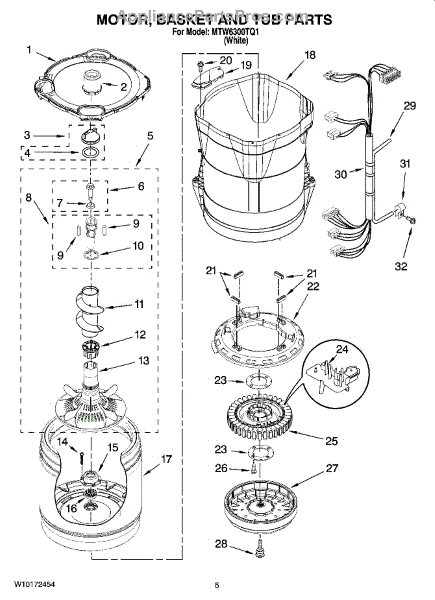 Outer tub assembly includes: outer tub, tub seal, drive shaft and bearings. To rebuild the tub, order the bearing and tub seal kit W10435302 and the bearing installation tool W10447783. When replacing this part, if you see that your motor stator is broken, search by your model number to make sure you get the right stator for your model.