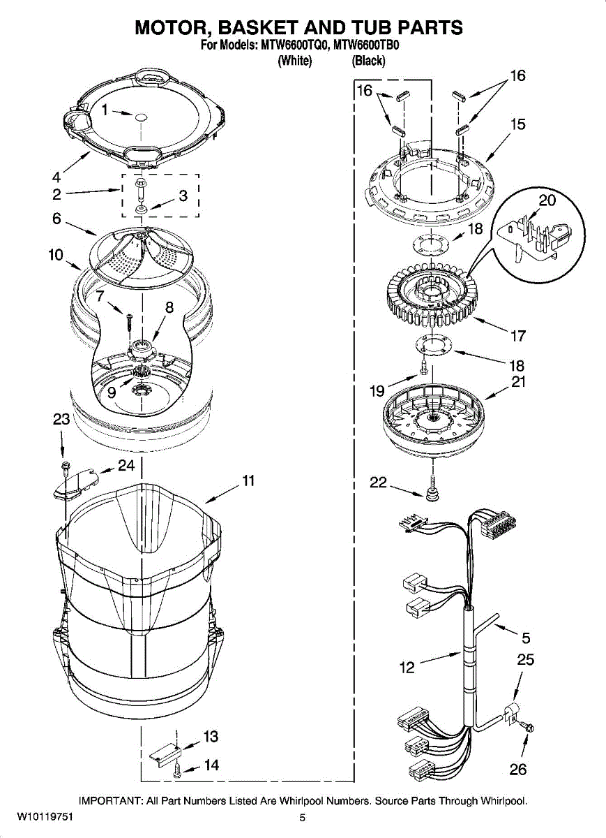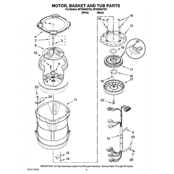 Outer tub assembly includes: outer tub, tub seal, drive shaft and bearings. To rebuild the tub, order the bearing and tub seal kit W10435302 and the bearing installation tool W10447783. When replacing this part, if you see that your motor stator is broken, search by your model number to make sure you get the right stator for your model.