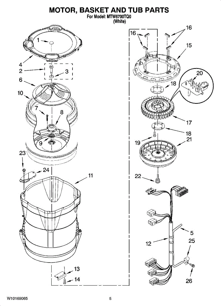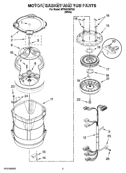 Outer tub assembly includes: outer tub, tub seal, drive shaft and bearings. To rebuild the tub, order the bearing and tub seal kit W10435302 and the bearing installation tool W10447783. When replacing this part, if you see that your motor stator is broken, search by your model number to make sure you get the right stator for your model.