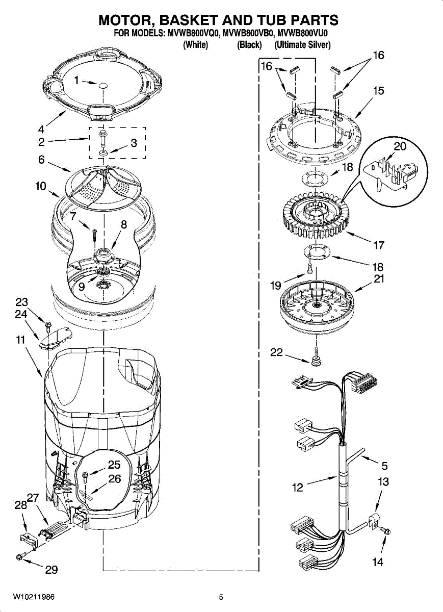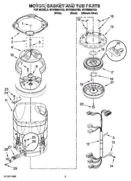 Outer tub assembly includes: outer tub, tub seal, drive shaft and bearings. To rebuild the tub, order the bearing and tub seal kit W10435302 and the bearing installation tool W10447783.