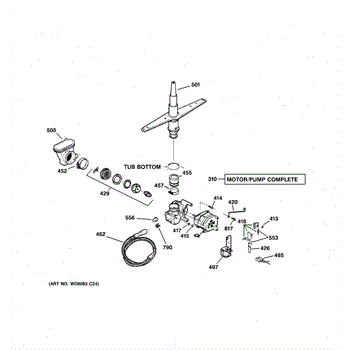 The Spray Arm Assembly is an OEM part for GE dishwashers. This component is located at the bottom of the dishwasher and is responsible for distributing water to clean the dishes during the wash cycle. It rotates to ensure that water reaches all areas within the dishwasher, providing thorough cleaning of the dishes.