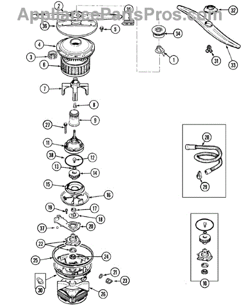 This dishwasher impeller assembly mounts on the circulation pump and pressurizes wash water for the spray arms. Replacing a worn or damaged impeller restores proper spray pressure, cleaning performance, and quieter operation.