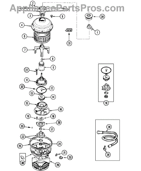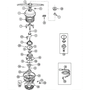 This dishwasher impeller assembly mounts on the circulation pump and pressurizes wash water for the spray arms. Replacing a worn or damaged impeller restores proper spray pressure, cleaning performance, and quieter operation.