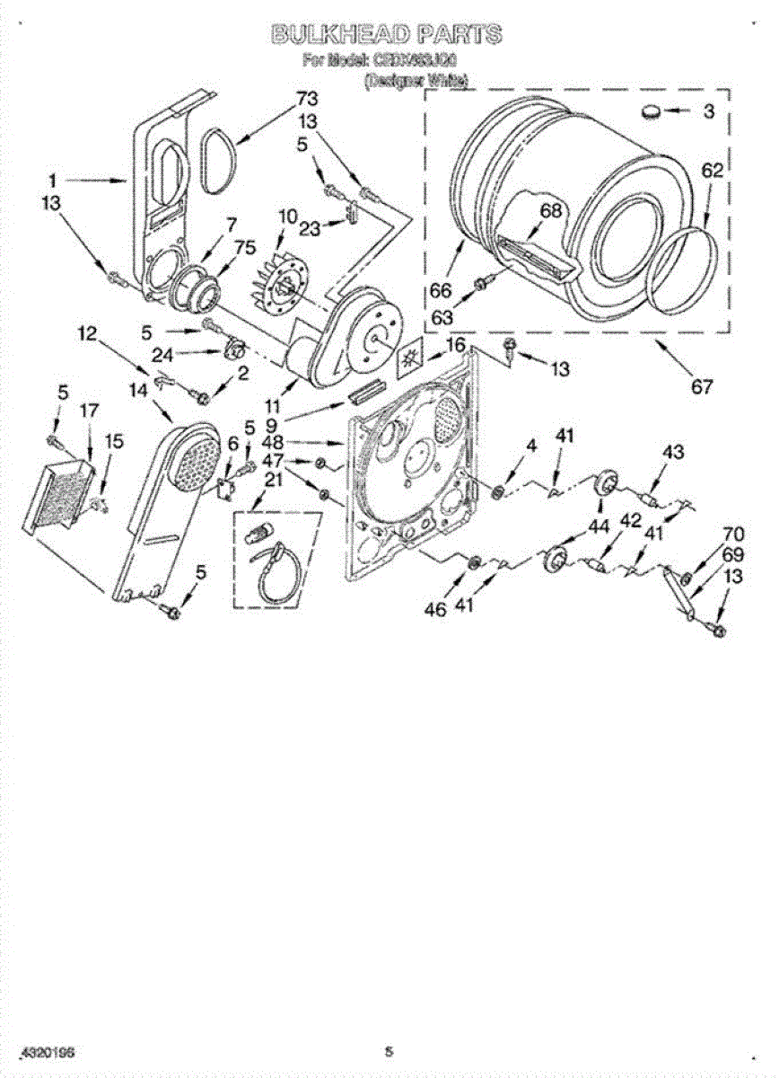 Replacement drum front bulkhead for dryers. Installs at the front of the drum assembly. Needed when original is cracked, damaged, or worn out.