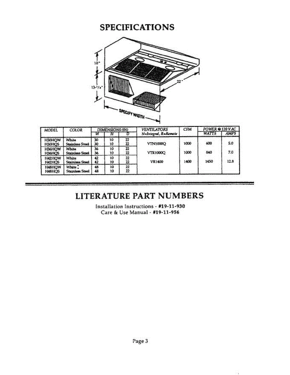 Parts for Thermador H36HQW: 03 - Specifications & Literature Parts