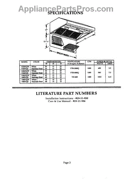 Parts for Thermador H42HQS: 03 - Specifications & Literature Parts