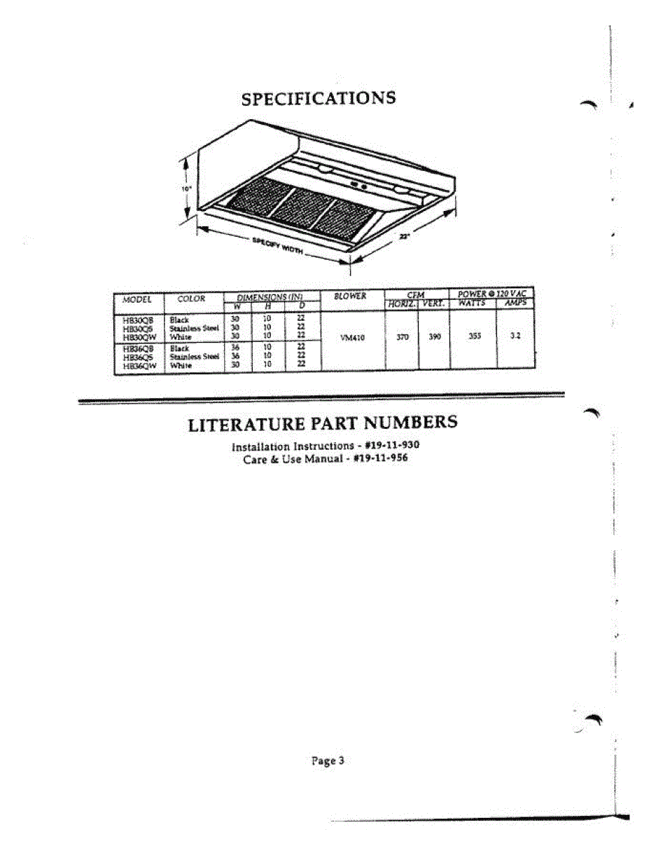 Parts for Thermador HB30QS: 03 - Specifications & Literature Parts