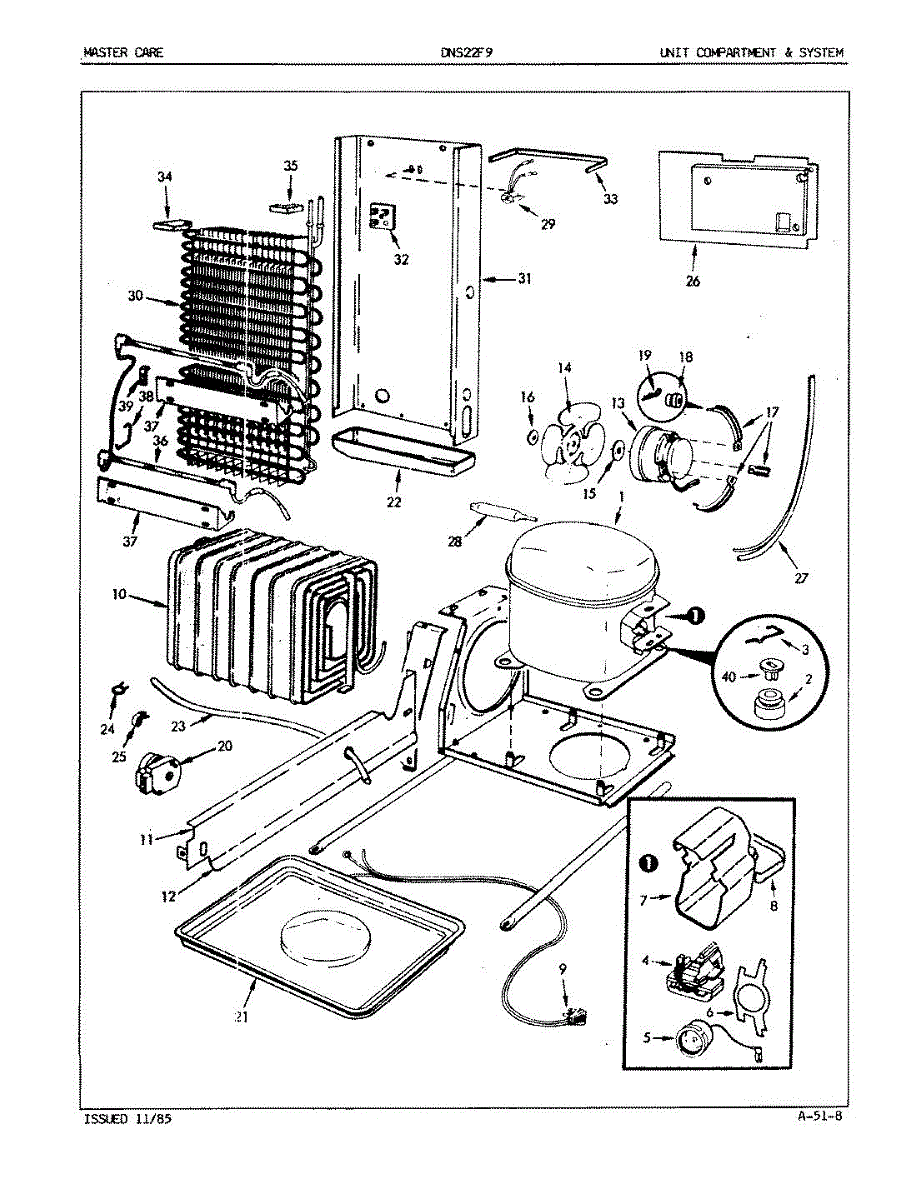 Plastic defrost pan. Evaporator pan hangs from side rails and rests on compressor.